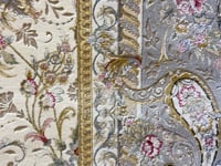 Its soft taupe field, accented by delicate rose, ivory, and gold floral patterns, evokes a sense of luxury and serenity. The intricate central medallion and detailed borders showcase unparalleled craftsmanship, creating a rug that radiates both sophistication and warmth.