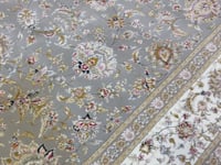 The Parimah Persian Rug is a true celebration of Persian artistry and refined living. Woven with an impressive 1500 reeds and 4500 density, this rug exemplifies the perfect blend of traditional elegance and modern craftsmanship. Its soft blue field, adorned with intricate floral motifs and framed by a delicate ivory border, brings an air of serenity and sophistication to any interior.